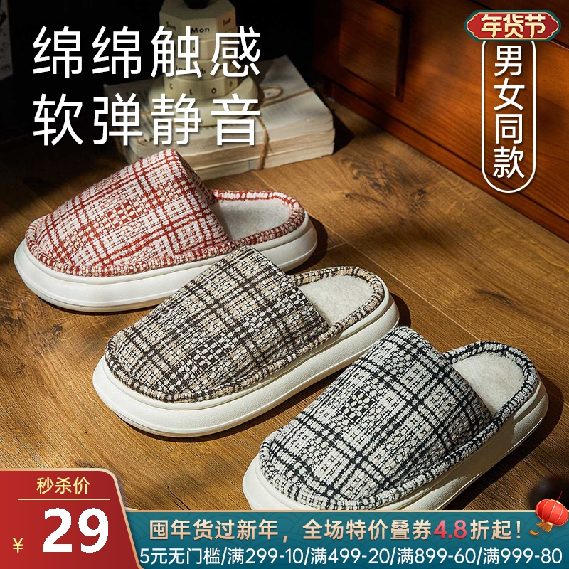 格纹毛绒保暖拖鞋