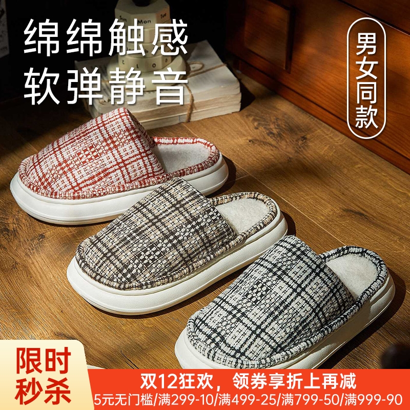 格纹毛绒保暖拖鞋