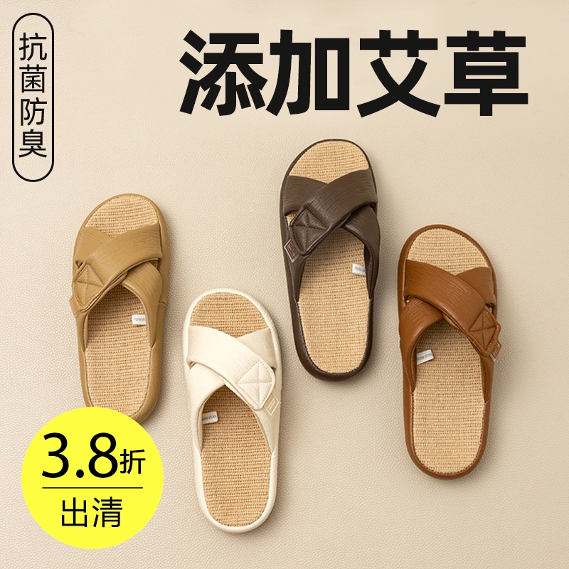 交叉皮革亚麻拖鞋