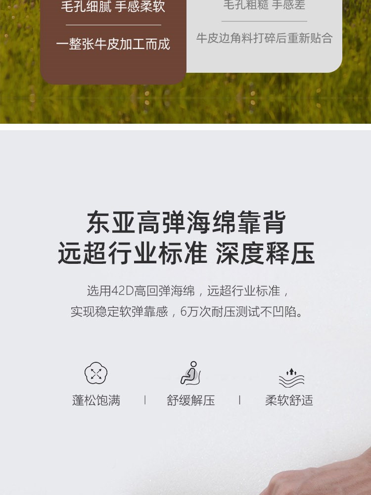 - 材质:北美进口头层牛皮+东亚高弹海绵+钢木排骨架+碳素钢脚
