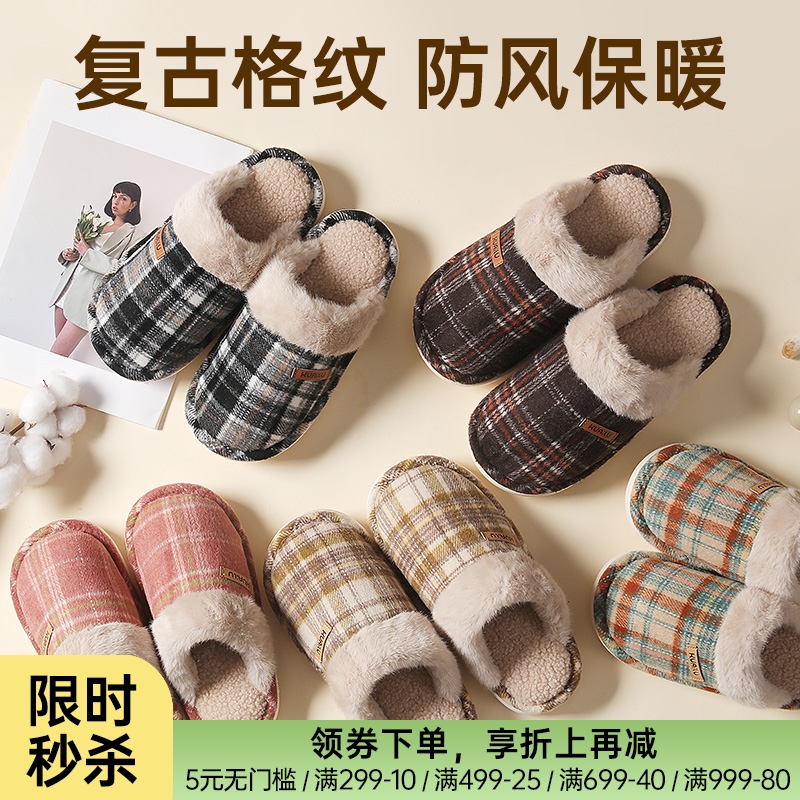 格纹毛绒保暖拖鞋
