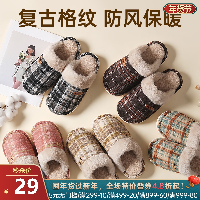 格纹毛绒保暖拖鞋